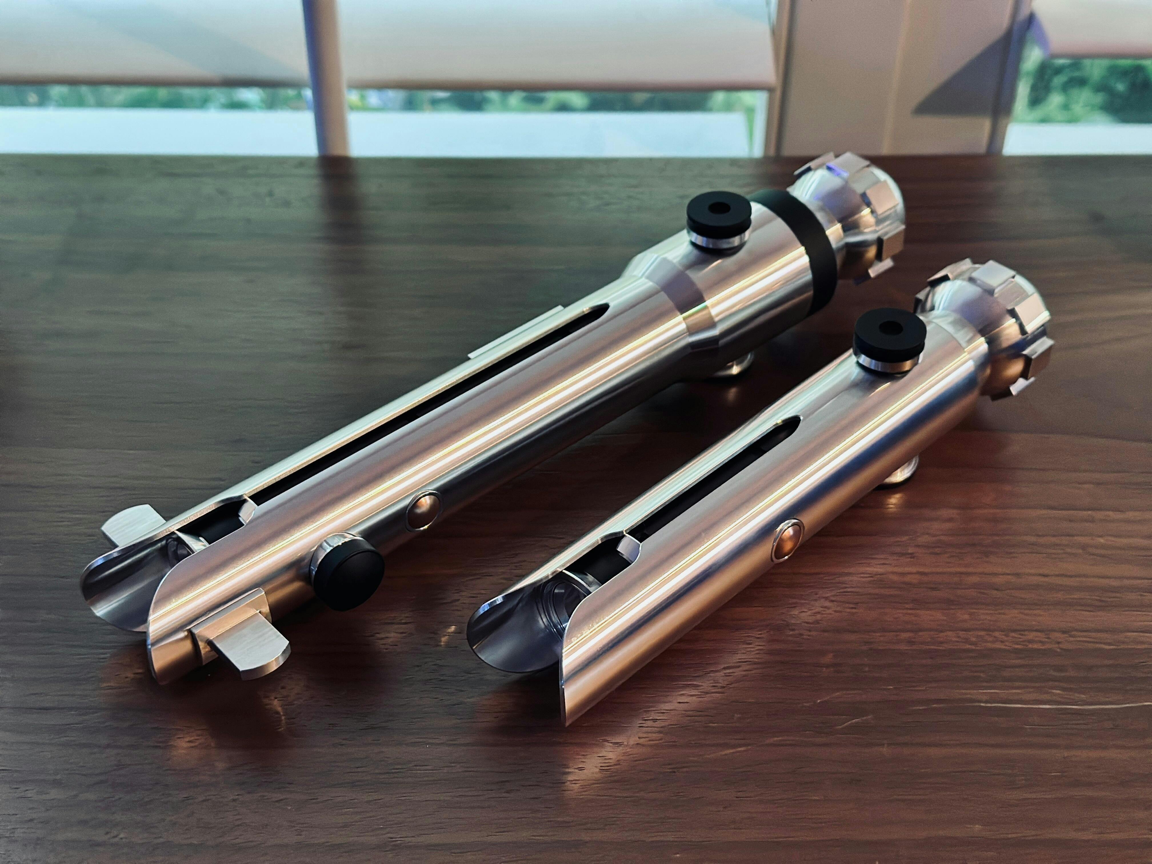The set contains both the main hilt (Main) and the off-hand grip (Shoto). The hilts are made of aluminum 6061. Both hilts have a 7/8" blade holder, matching blade plugs are also included. The main has two spring-loaded switch plungers, the Shoto has one. A closed and a vented pommel are supplied for both sabers, which can be exchanged at any time The hilts come in a high-quality collector's box.